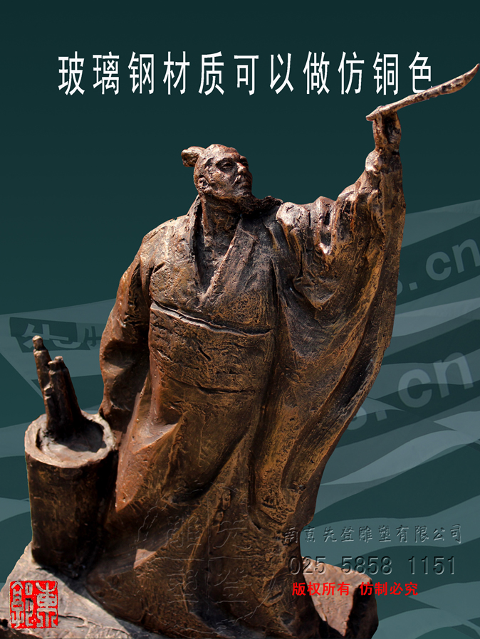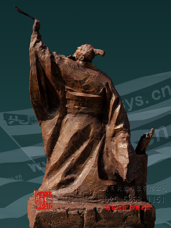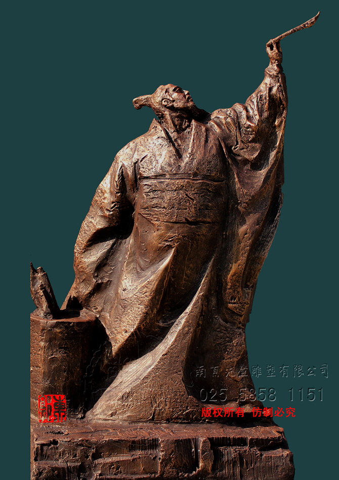 張芝字伯英,出生官宦之家,幼時(shí)高操,勤習(xí)學(xué)書,朝廷賞識(shí),令他做官,而他并非貪圖高官厚祿,甘做布衣。素日臨池學(xué)書,得崔杜之法,復(fù)而變之,遂成“今草”。張芝對(duì)書藝癡醉令人驚嘆。衛(wèi)恒《四體書勢(shì)》里有言“凡家之衣帛,必先書而后練之。臨池學(xué)書,池水盡墨。”張芝對(duì)于書法藝術(shù)的不斷索求,終成一代“草圣”,當(dāng)是“為世所寶,寸紙不遺”。雕塑里張芝如平日習(xí)作,但見他揚(yáng)手,握管,在虛空中縱姿揮毫,一如其書法,一筆而就,不拖沓凝滯,衣袍素袖宛如字之體勢(shì)婉轉(zhuǎn)流暢,舒箋觀鳥跡,研墨染魚緇。