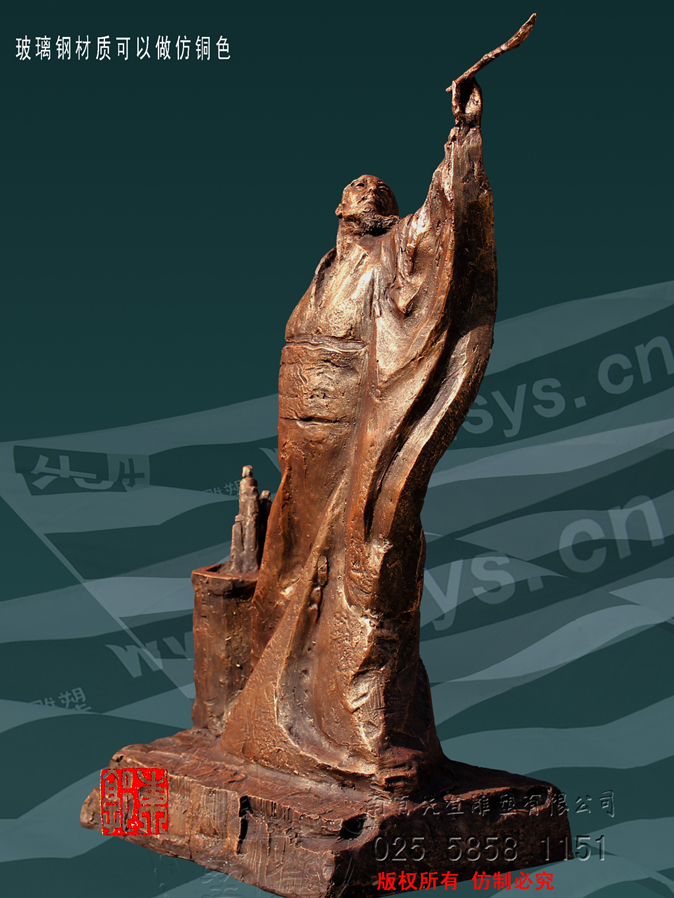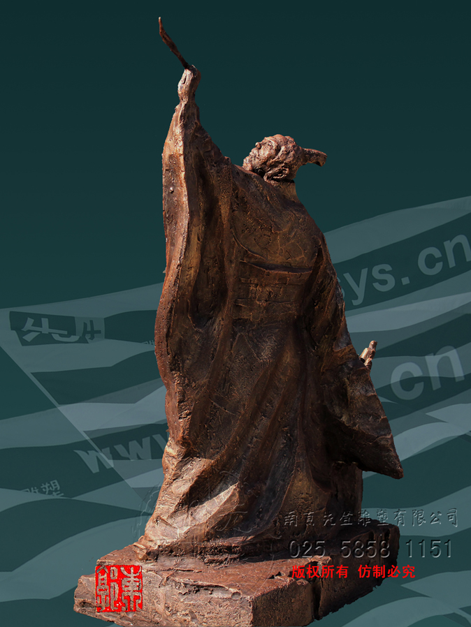 張芝日復(fù)如是,墨池水染,而筆法精湛,雕塑中東郭先生作得人物身后立有一口水甕,代指墨池,身側(cè)為書卷參差錯(cuò)落,不復(fù)你從何角度,都自成一番風(fēng)景,似有不容于世,不饗物之芳華,身在日月山川之外。都言,字若其人,觀其字,當(dāng)是一筆所成,偶有不連,而血脈不斷,字跡氣脈相通,成山川險(xiǎn)象。但又看先生雕塑,筆墨有無(wú)間,衣緇素縷暗藏儂華,轉(zhuǎn)載沉浮里,風(fēng)華涌動(dòng),通了天地的氣運(yùn),又通曉世間閭閻,真是出塵入世,字若人,行走在了日月山川里。真是人與山河并立。